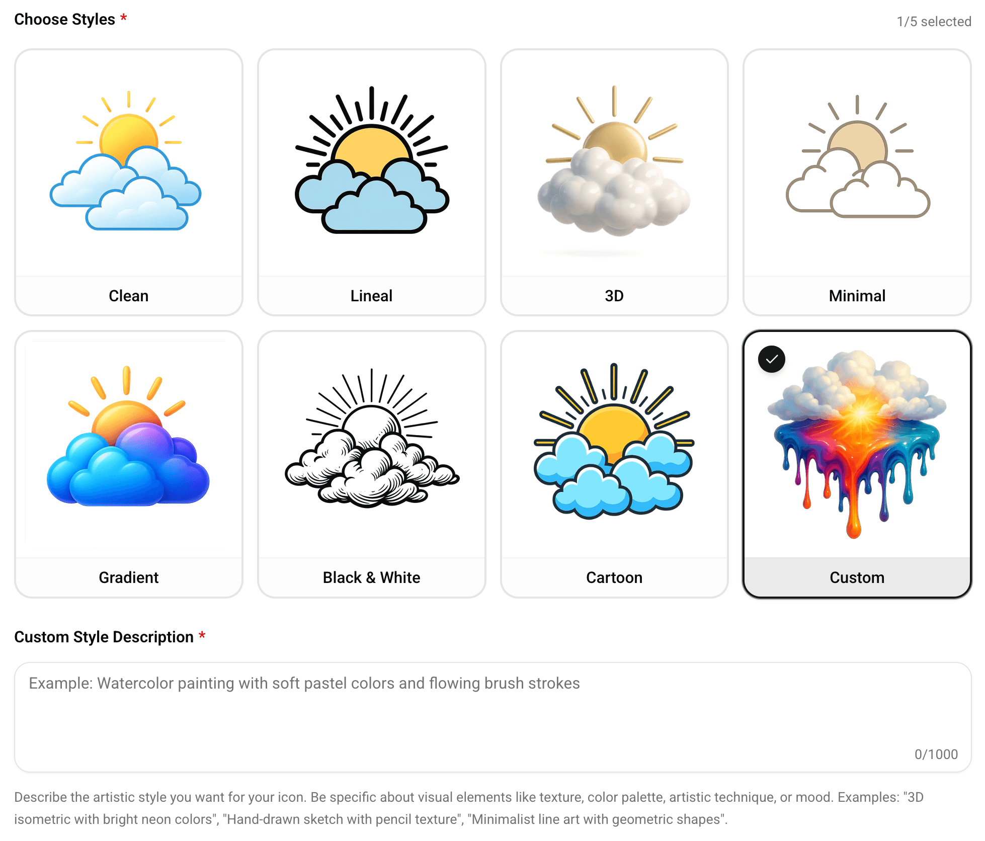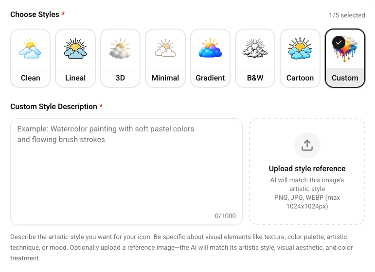 You can now enter a custom style prompt (e.g. "hand-drawn, pastel, playful") to guide the AI and produce icons adapted to your brand or creative vision.